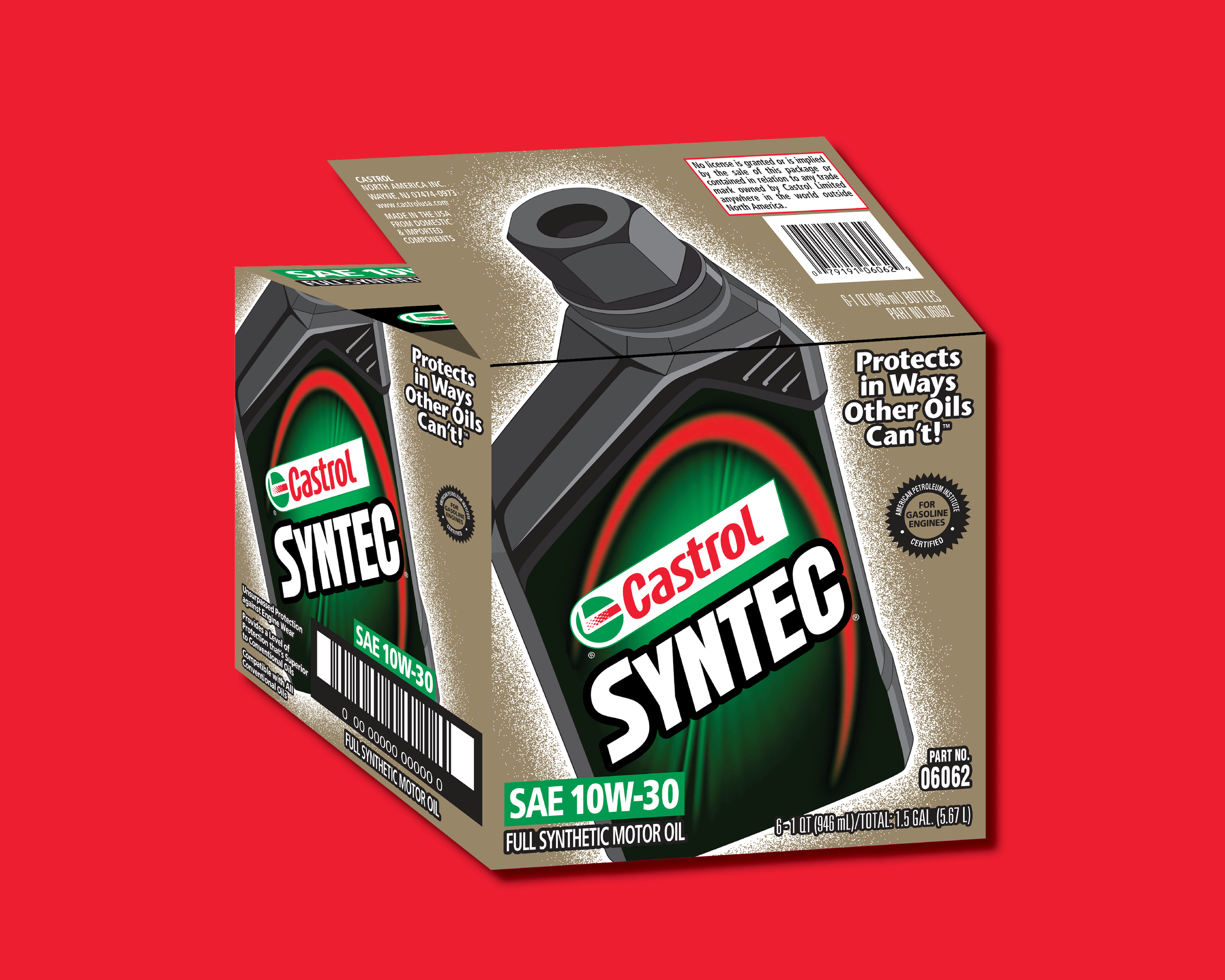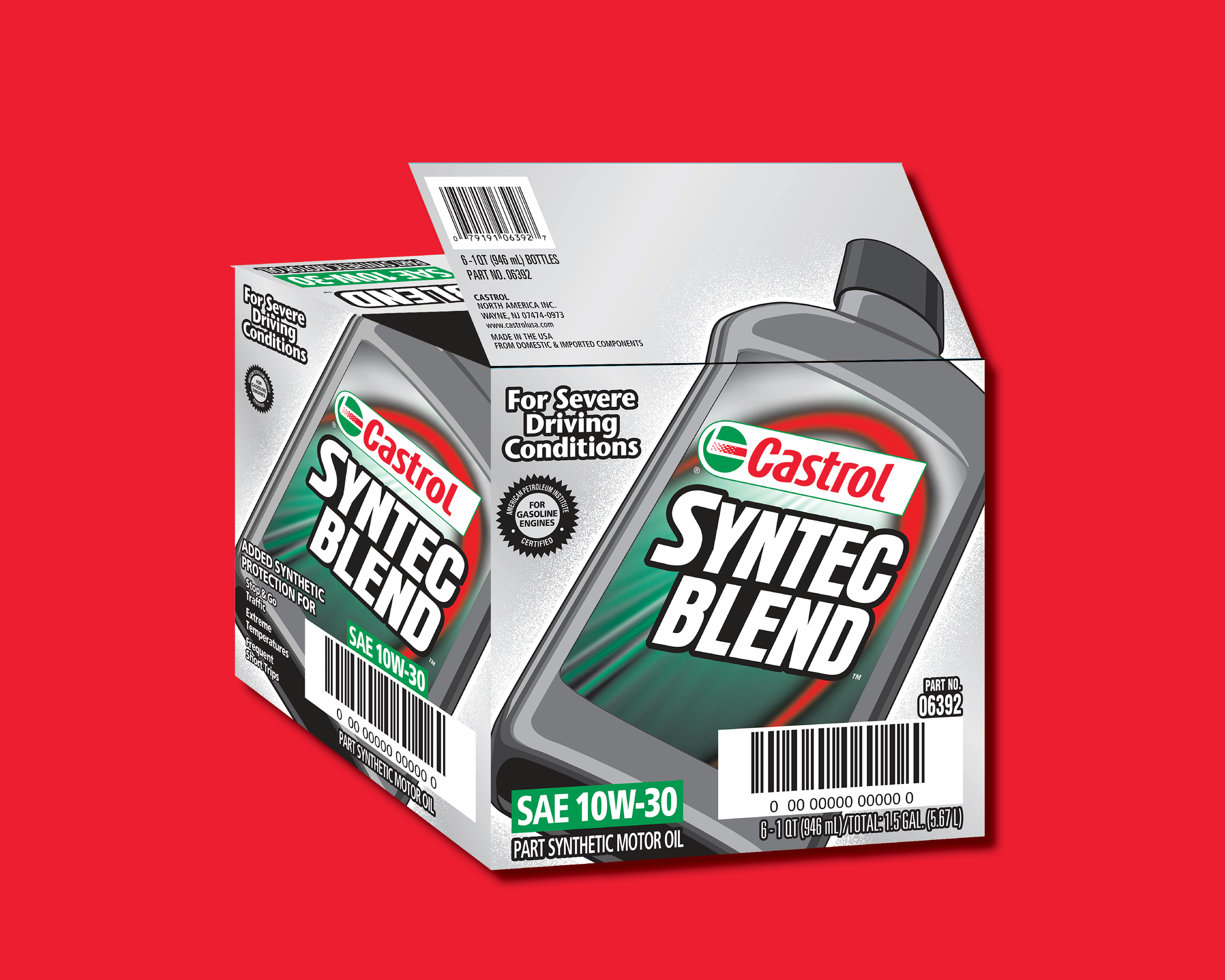 Castrol wanted to extend their brand rebuild after a new bottle design. To update their line of shippers for their GTX, Syntec, and Syntec Blend motor oils, I designed the box series to prominently feature the new bottle on the facing, while wrapping the neck and cap of the bottle over the top flaps. So pleased with the design of the new boxes, the packaging design manager of Castrol North America, wrote: “The new cases are more innovative and impactful on the shelf.”