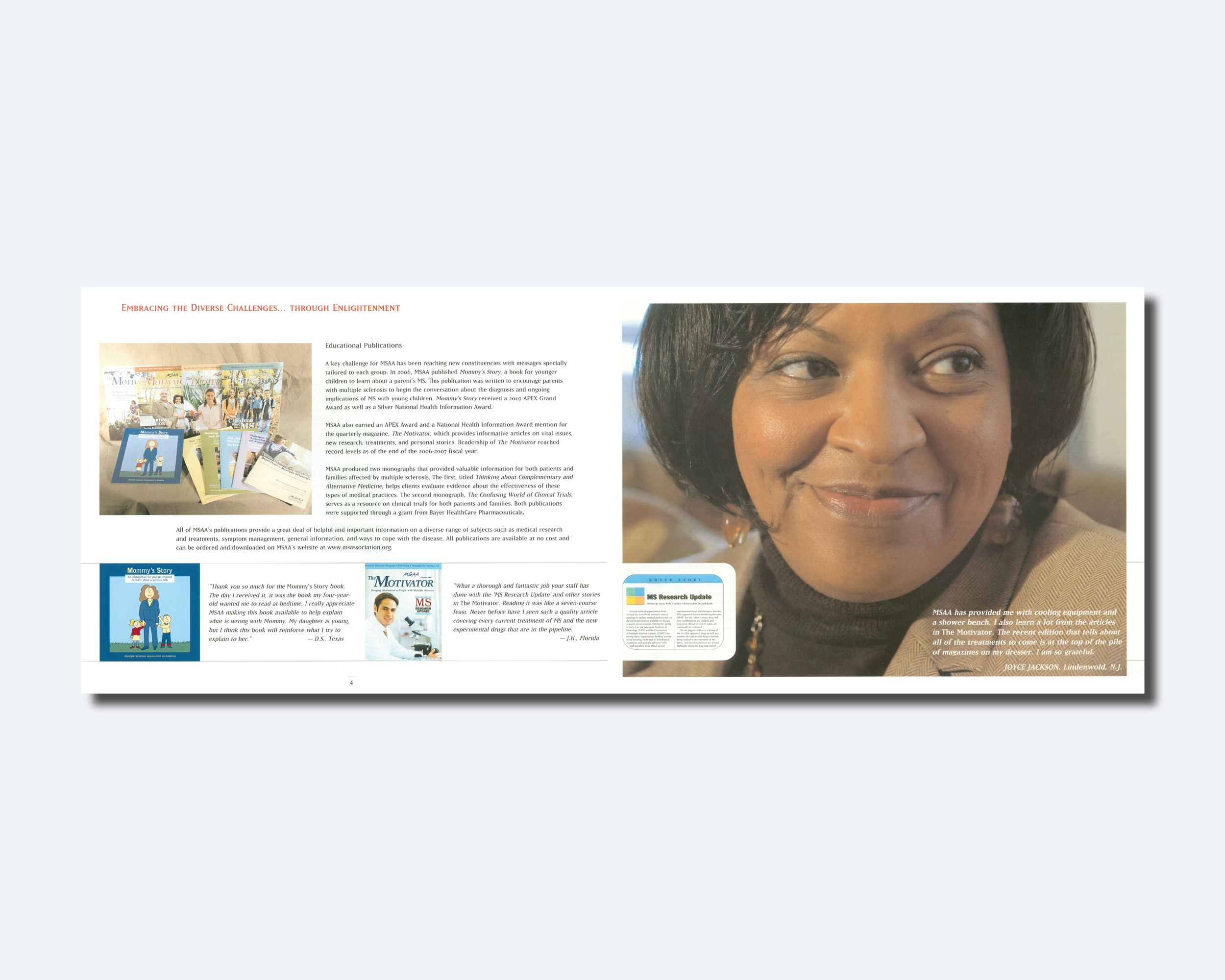 Speedy Motorcycle recently created MSAA’s corporate and extended logo system to rebrand with a fresher, more distinct, and updated look that conveys figural elements and community, along with an abstract starburst that references brain signals. For over 25 years, Speedy Motorcycle has been designing print collateral for MSAA, including numerous annual reports, brochures, children’s books, logos, publications, and posters.