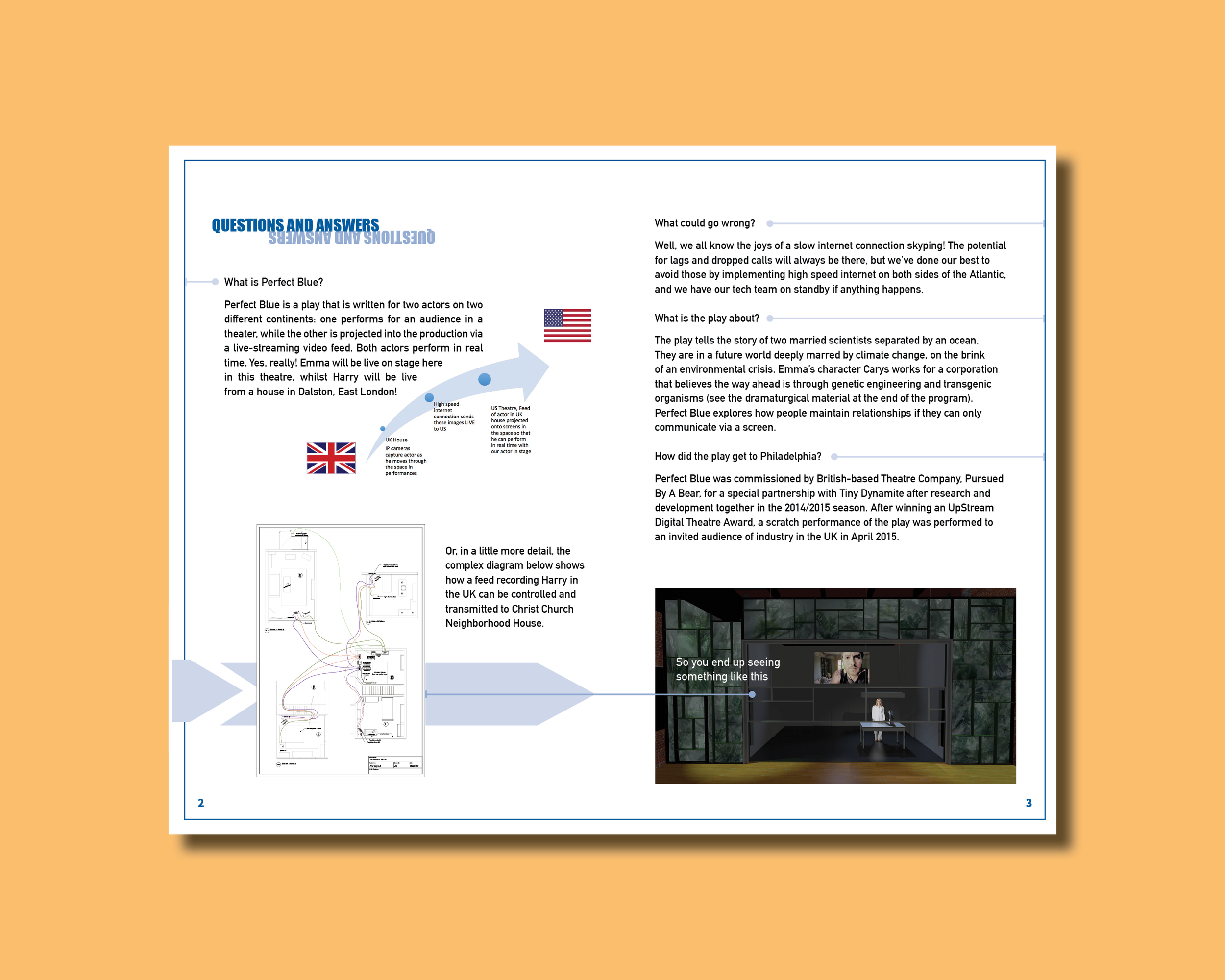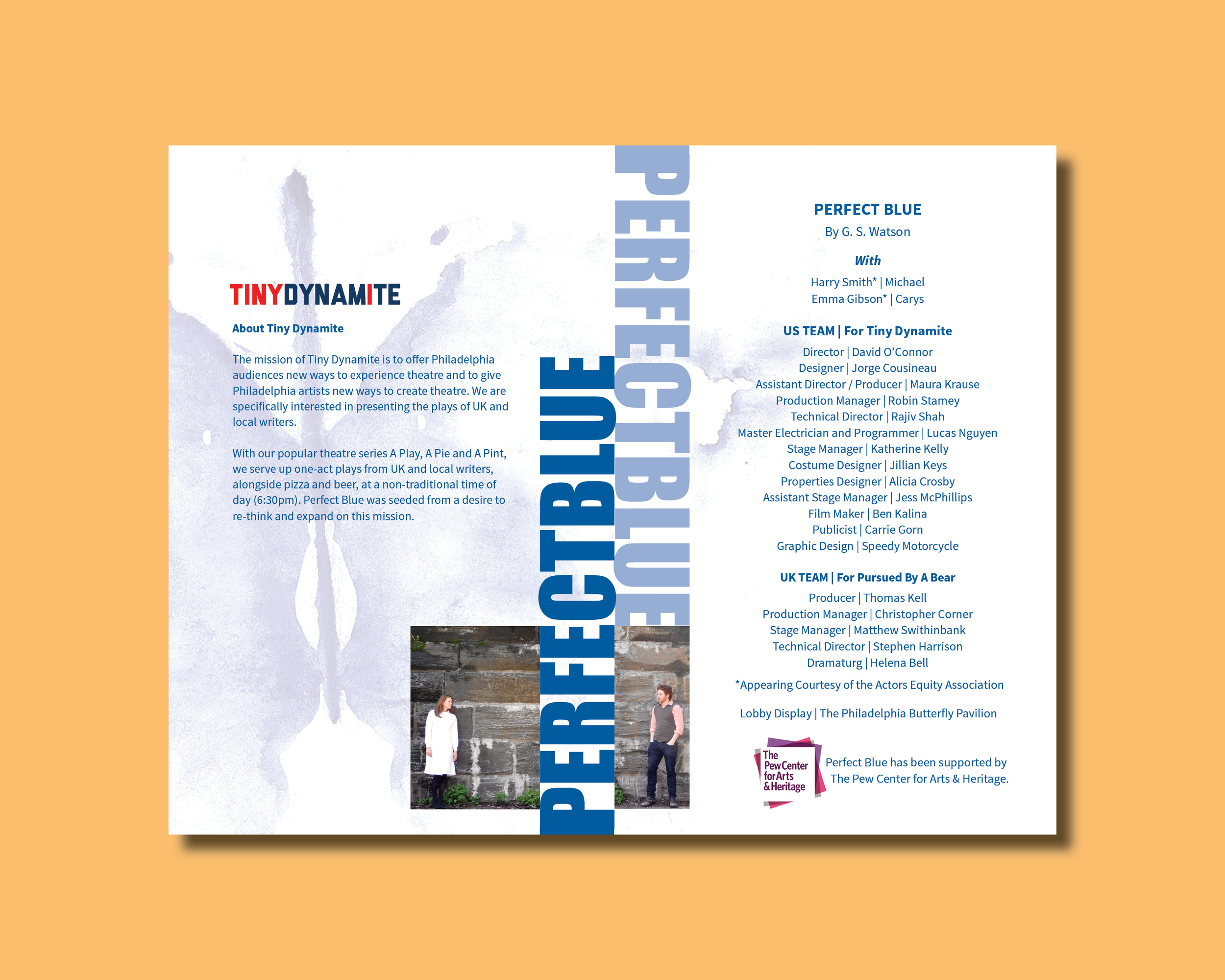 Printed collateral for Tiny Dynamite theatre company. The performance is a futuristic thriller where two scientists from either side of the Atlantic are thrown into a new kind of war that threatens to engulf the planet and tear their relationship apart. Performed by two actors in two different countries — using film, theatre, and a live video link to London — this award-winning production is a gripping story of love and betrayal.