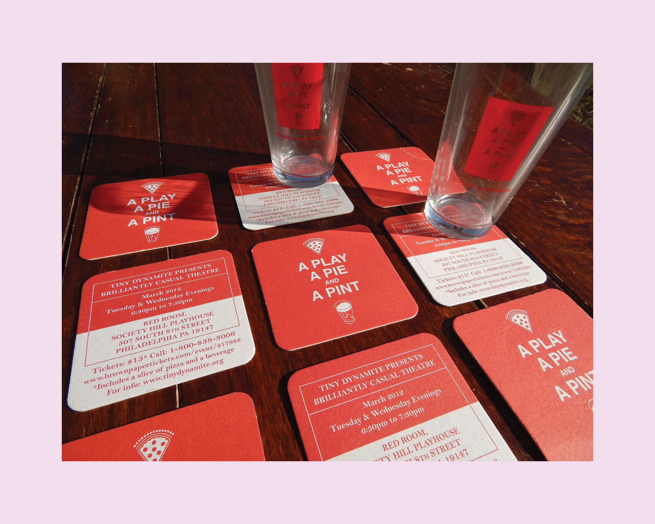Work created for A Play, A Pie, and A Pint, a theatre production at the Society Hill Playhouse in Philadelphia, PA. Promotion had resulted in sold-out shows for the series of performances and increased donations to Tiny Dynamite, the independent theatre company that would go on to produce the Play, Pie, Pint performances for more than a decade.